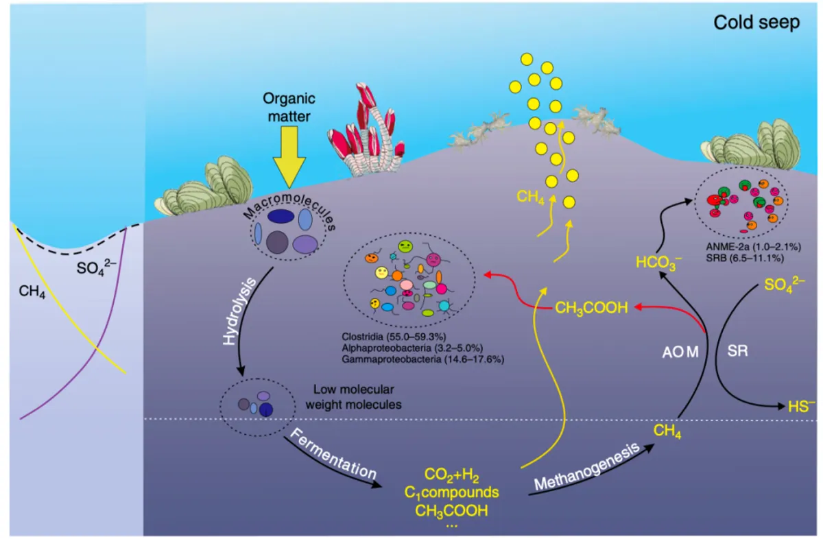 甲烷氧化:冷泉微生物群落氧化大量甲烷,减少甲烷向大气释放,起到”生物过滤器”的作用。